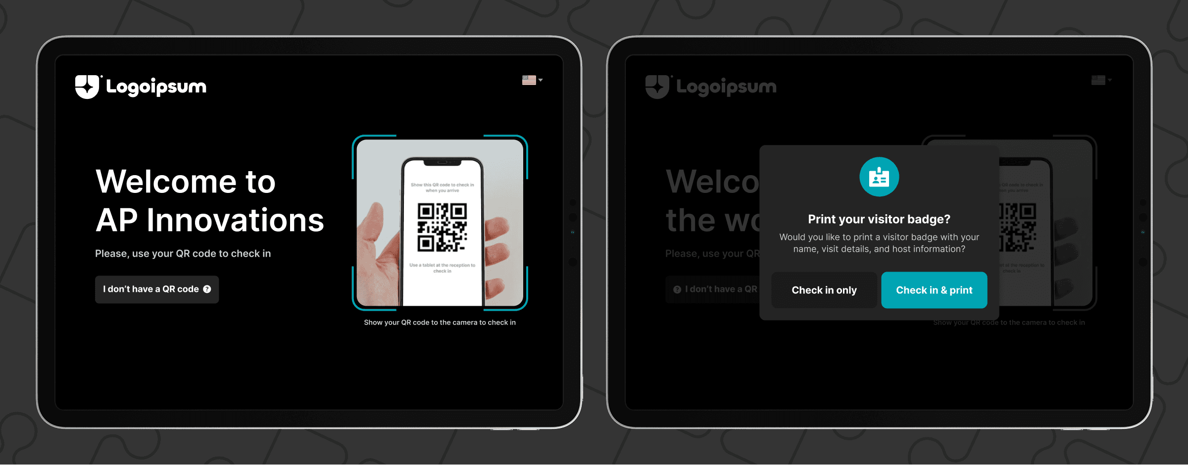 In addition to the booking panels, I also designed Spaceti’s Digital Reception - a tablet app used at office entrances. It replaces the traditional front desk with a clear, self-service flow. Guests check in by scanning a QR code from their invitation email, instantly notifying hosts and guiding visitors through the entry process. The goal was the same as with the panels: reduce friction, make states obvious, and let people move through the space without needing explanations.
