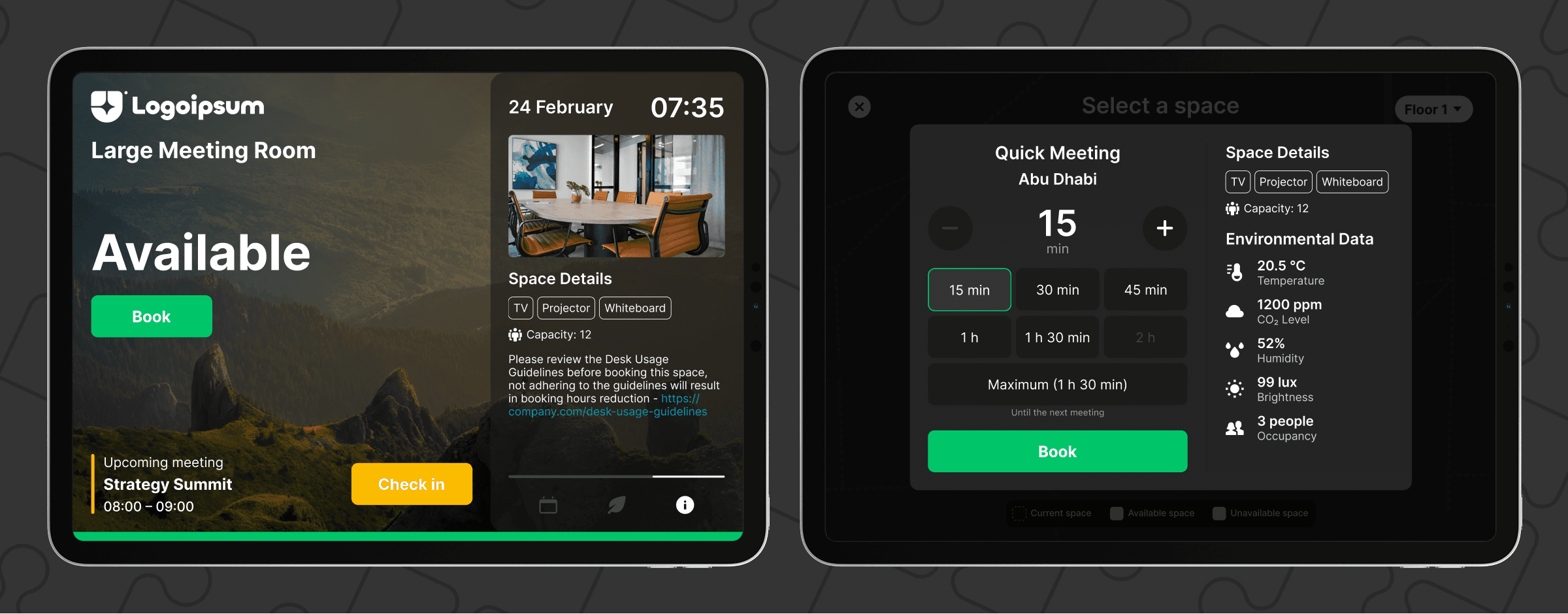 The tablet by the door shows what’s happening now and next. You can book an instant meeting, check into a pre-booked slot, extend time, or review the schedule. A bottom status bar makes the room state obvious at a glance. If the room is busy, Find another space offers fast alternatives. Capacity, equipment, rules, and health notes are easy to access. Environment data (CO₂, temperature, air quality) and additional room info live in a side panel - useful, not noisy.